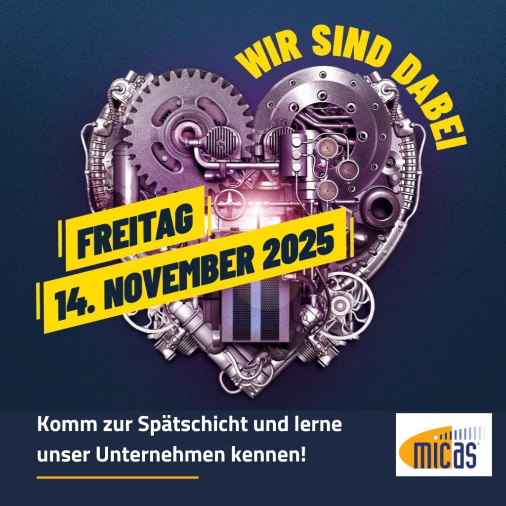 Am Freitag, den 14. November 2025, beteiligt sich die micas AG an der Spätschicht 2025 und öffnet in Oelsnitz/Erzgebirge, Turleyring 22 die Tore für alle, die Technik, Innovation und Zukunft hautnah erleben möchten. Unter dem Motto „Von der Idee bis zur Produktion“ gewähren wir exklusive Einblicke in die Welt der Sanitärsensorik, Elektronikentwicklung und IoT-Lösungen.